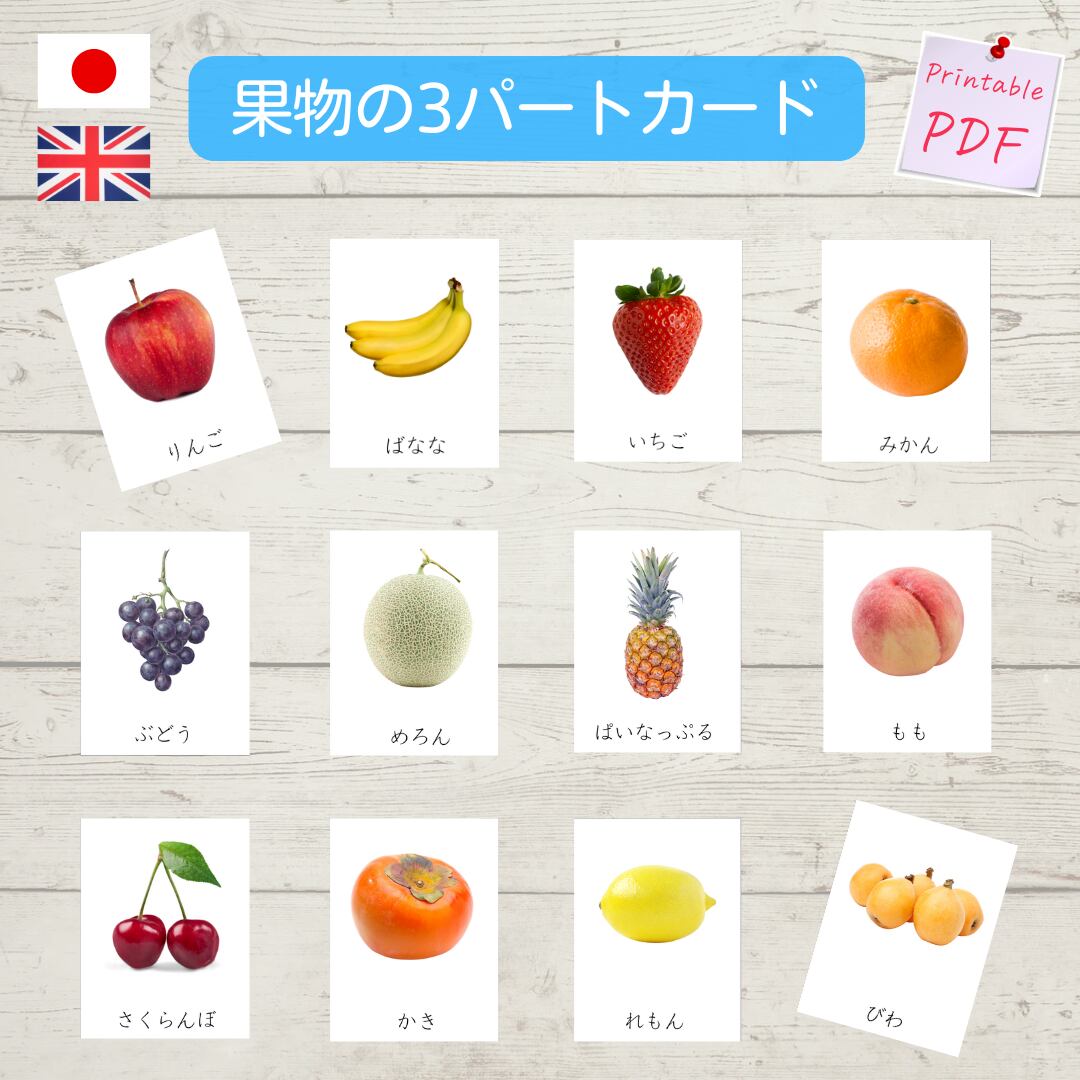 日常で親しみのある「くだもの」をテーマにした、モンテッソーリ方式の3パートカードです。