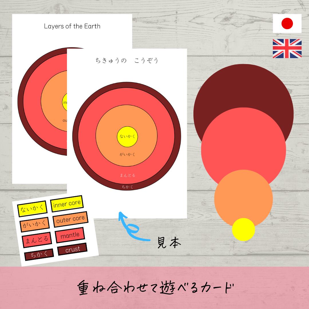 地球の「中心から外側までの構造」をテーマにした、モンテッソーリ方式の3パートカードです。